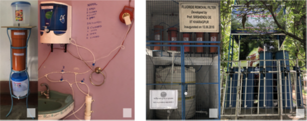 Fluoride-removal filters deployed across West Bengal: from early household prototypes (top left) to the commercialised version now in use (top right), and from a community-scale prototype installed in a school (bottom left) to the solar-powered community filter operating in a rural village (bottom right). Taken from [1].