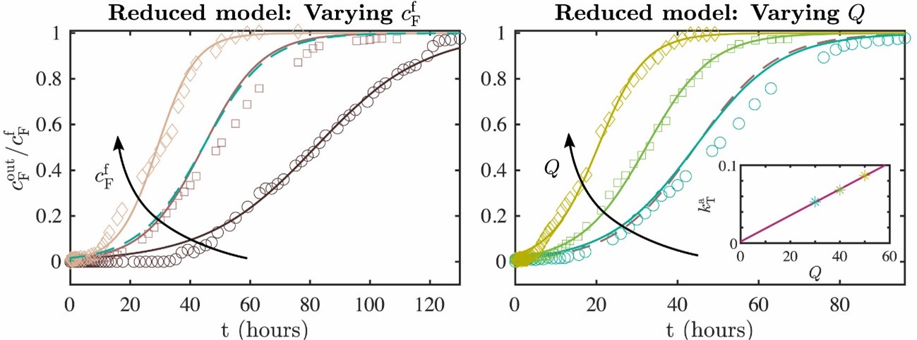 Breakthrough curves showing when fluoride begins appearing at the filter outlet. The reduced model (solid lines) accurately predicts experimental measurements (data points) across varying inlet fluoride concentrations (left panel) and flow rates (right panel). The model captures filter behaviour under different operating conditions using just one adjustable parameter, demonstrating its predictive power and practical utility for filter design. Taken from [1].