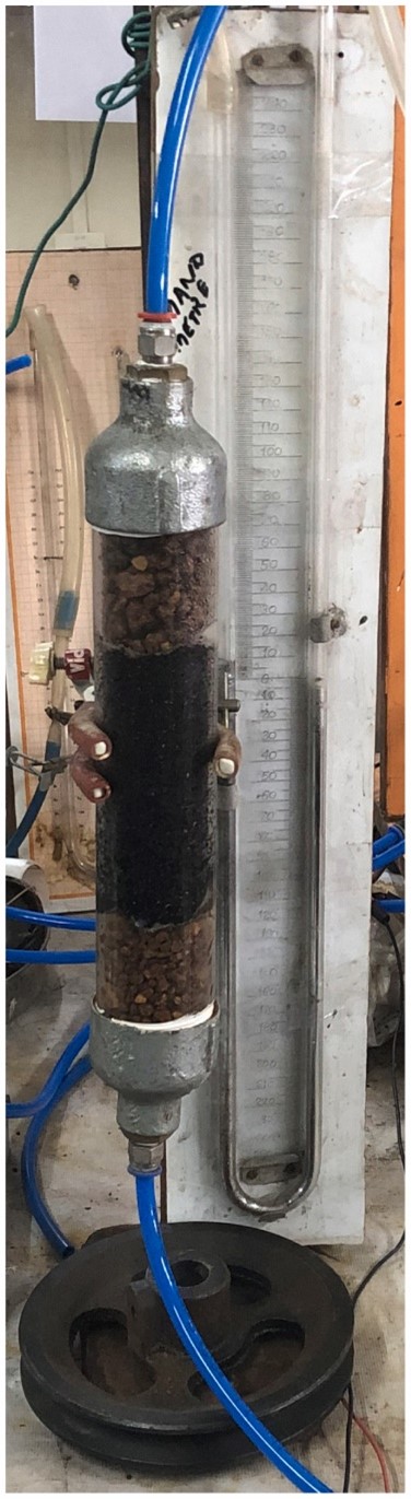 Laboratory column filter at IIT Kharagpur used to validate the mathematical model. Contaminated water flows through the packed cylinder, with fluoride concentration measured at the outlet over time. Taken from [1].
