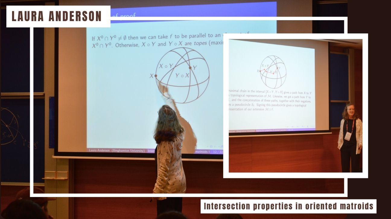 Laura Anderson, professor at Binghamton University, focuses her research on the interplay between combinatorics and topology, especially oriented matroids, convex polytopes, and combinatorial models of topological spaces. She is the author of Oriented Matroids (Cambridge University Press, 2025), a geometrically motivated and accessible introduction to the subject. In her course, Intersection properties in oriented matroids, Anderson explored how non-realizable matroids can violate basic geometric and topological intuitions. She discussed properties such as the Euclidean property and other intersection phenomena that challenge our understanding of combinatorial space.
