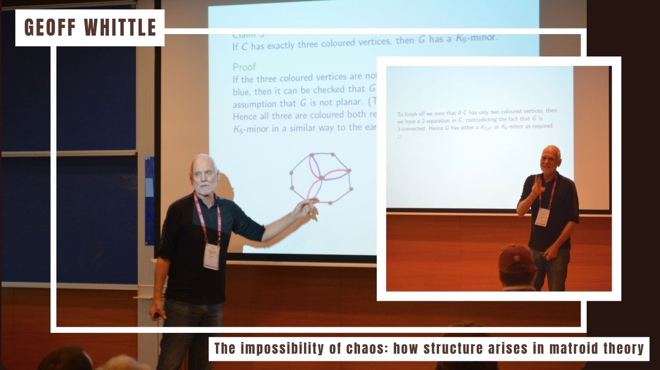 Geoff Whittle, professor at Victoria University of Wellington, is known for his contributions to the structural theory of matroids. In his course, The impossibility of chaos: how structure arises in matroid theory, Whittle showed how, despite the apparent wildness of general matroids, structure inevitably emerges. He explained how the exclusion of certain substructures leads to highly organized classes of matroids, such as binary matroids and those representable over all fields, drawing on seminal theorems by Tutte and Seymour.