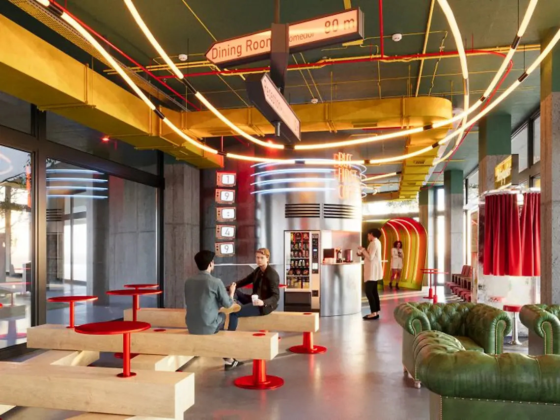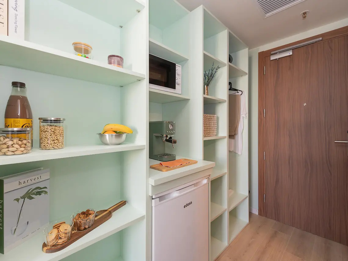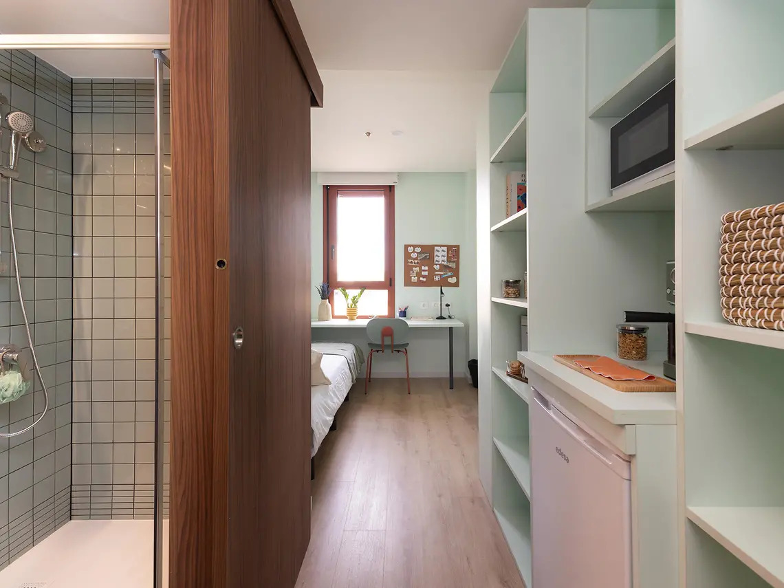 Fully furnished rooms/studios with desk, lamp, chair, and kitchenette (microwave + refrigerator). Private bathroom with shower and storage space. Amenities include air conditioning, heating, complimentary WiFi, and 24-hour security. Residents also benefit from unlimited access to communal facilities such as the fitness studio, study room, and cinema room.