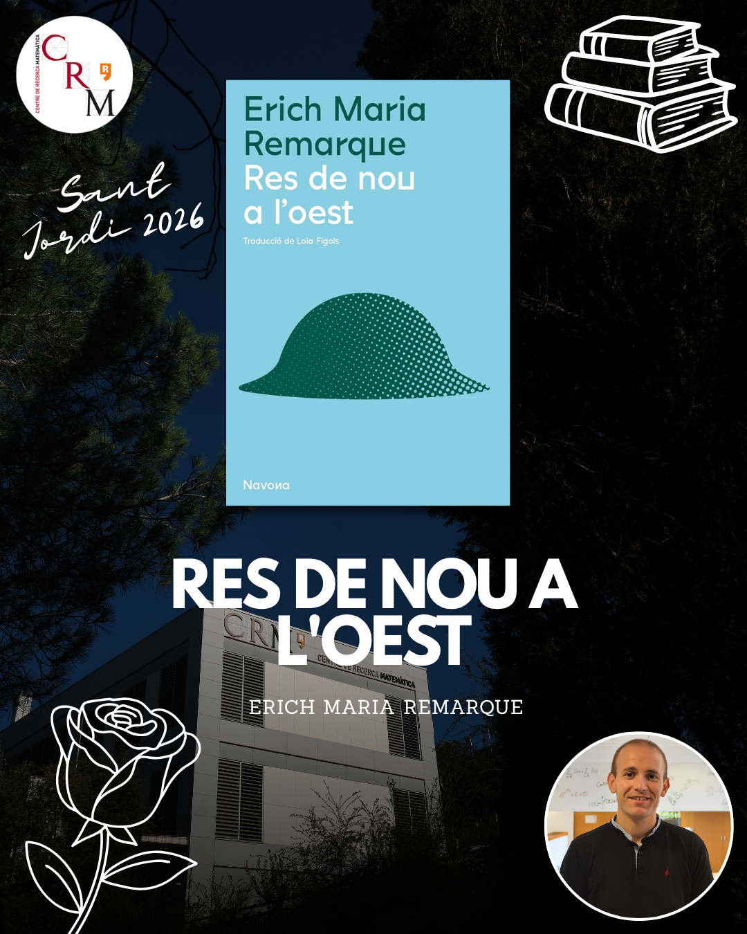 Per celebrar Sant Jordi hem demanat a la gent del CRM que ens recomani un llibre. Un. El que tingueu al cap ara mateix. Set persones han respost, i entre les set han aconseguit cobrir quatre idiomes, almenys tres segles i cap gènere repetit. Ciència-ficció, filosofia cartesiana, ficció literària, un clàssic antibèl·lic, surrealisme bèl·lic, estoïcisme i una novel·la sobre cossos de dona. Tot en una sola llista.