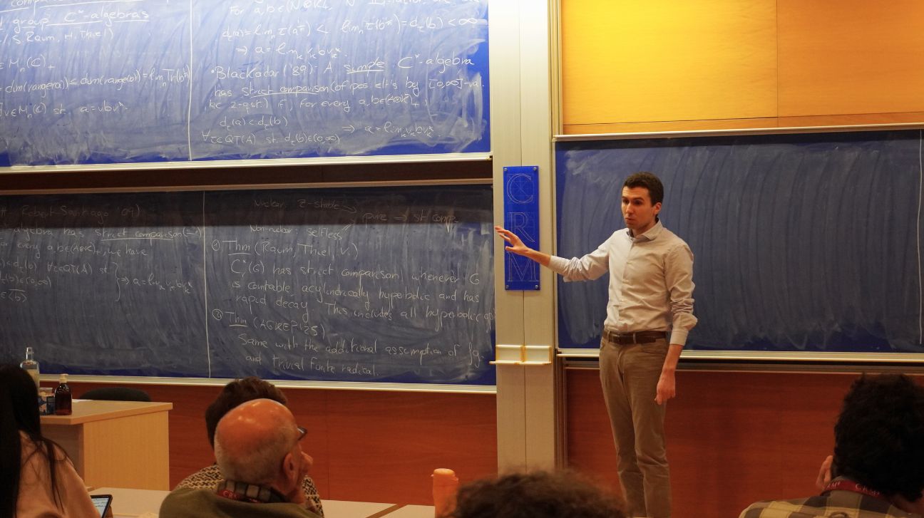 • Eduard Vilalta (Universitat Politècnica de Catalunya) presented Strict Comparison for Twisted Group C*-Algebras, highlighting recent progress on strict comparison and its versatility, with applications ranging from classification results to classical problems in group theory.