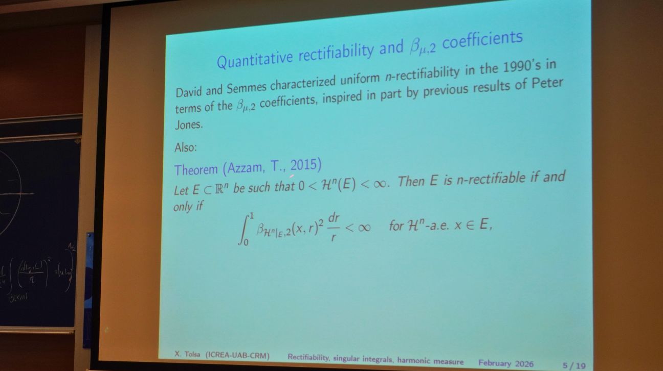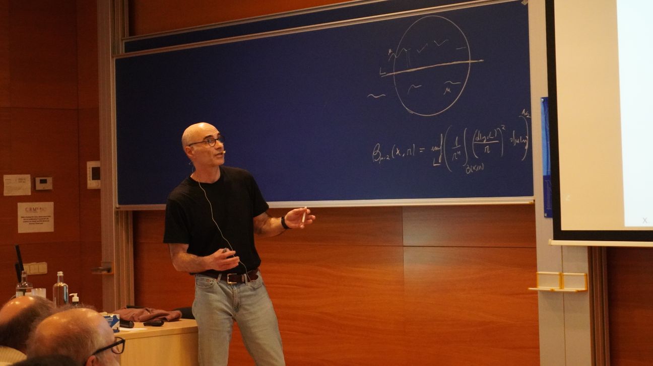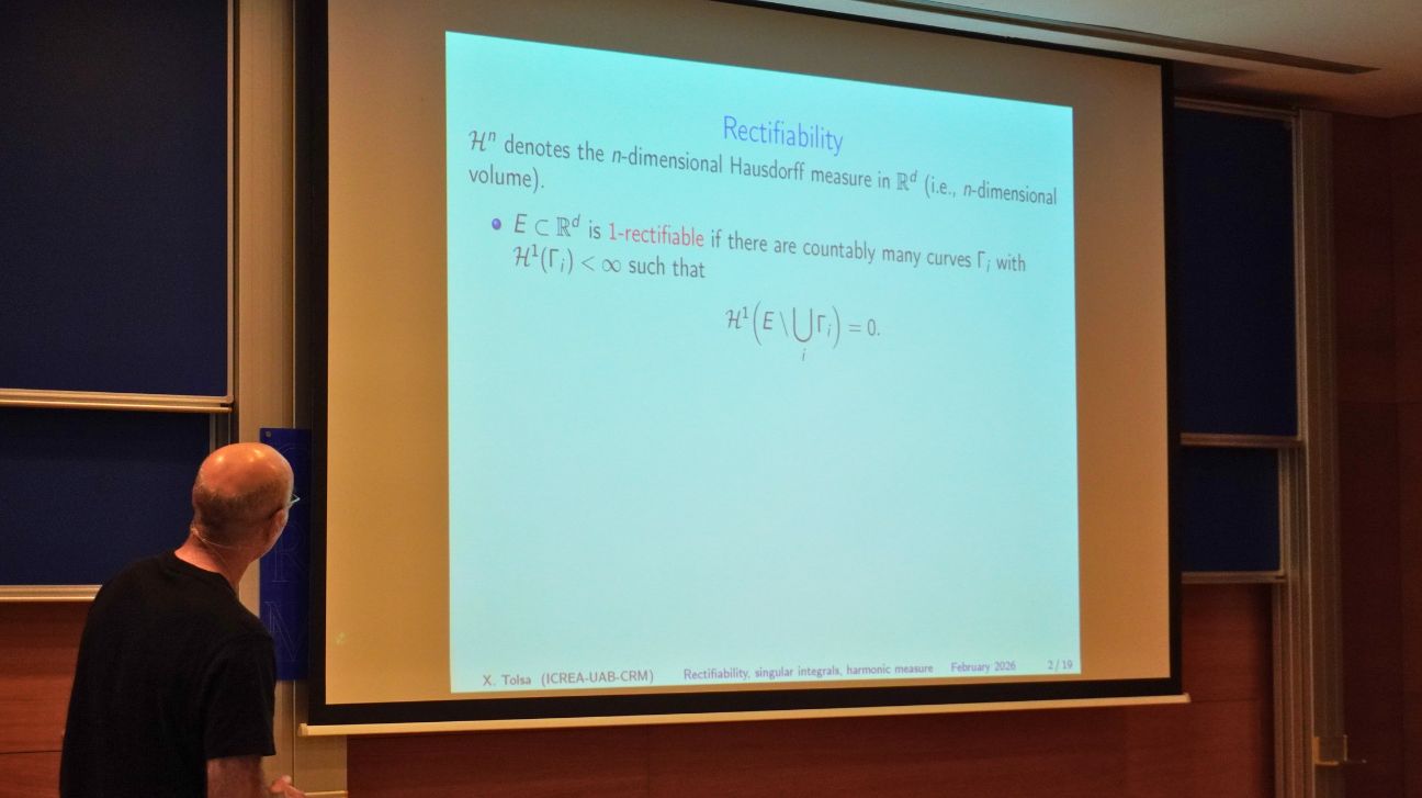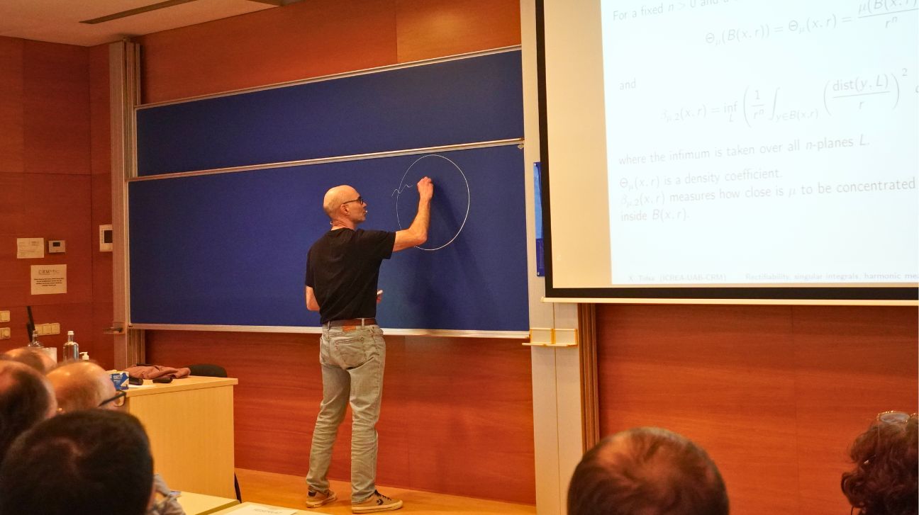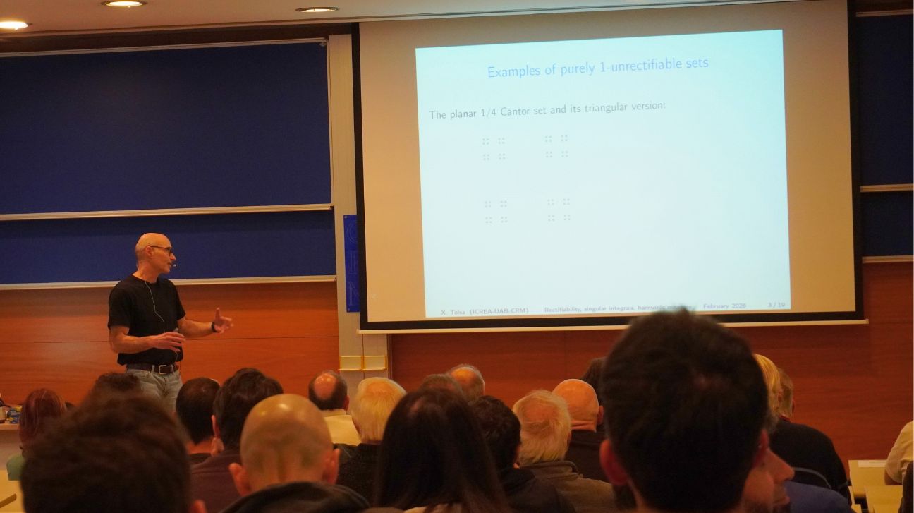 As highlighted by the CRM Director during the welcome remarks, the new colloquium aims to foster synergies between research groups, showcase recent advances, and strengthen internal scientific cohesion. In this context, the first talk was delivered by Xavier Tolsa (ICREA – UAB – CRM), titled Quantitative rectifiability, singular integrals, and harmonic measure. Tolsa, who will be a plenary speaker at this year’s ICM, introduced the foundations of quantitative rectifiability, a research area that links the fine geometry of sets with tools from harmonic analysis, such as square functions and singular integrals. Throughout his lecture, he revisited classical results while highlighting recent developments that have resolved deep problems related to harmonic measure, including the one-phase and two-phase cases, as well as new findings about its dimension. His talk allowed the audience to explore a highly active research field with connections ranging from analysis to potential theory and partial differential equations.