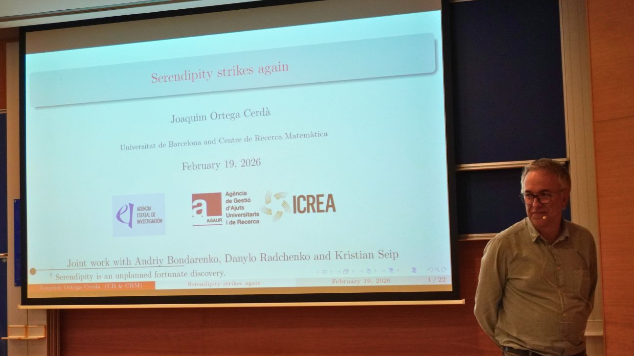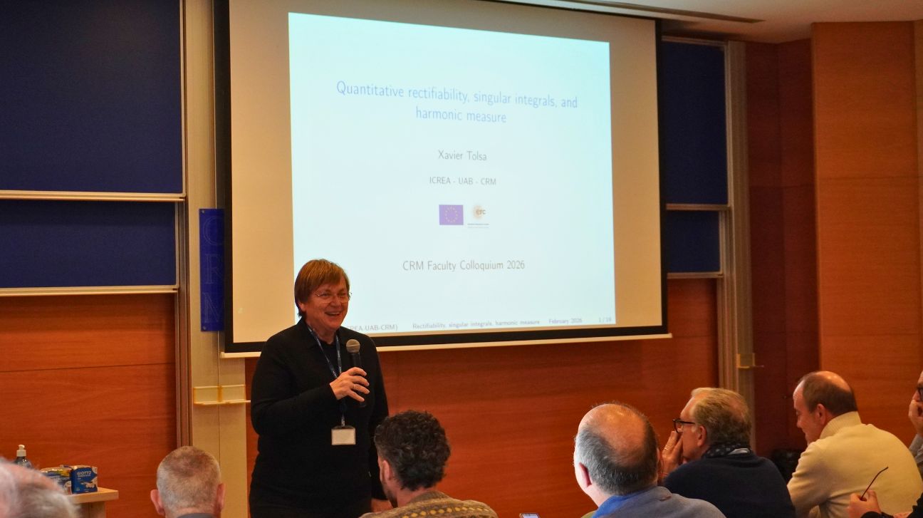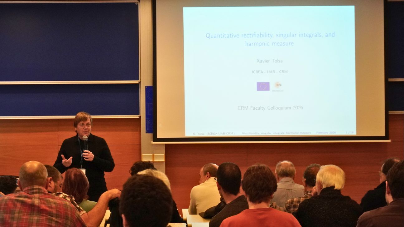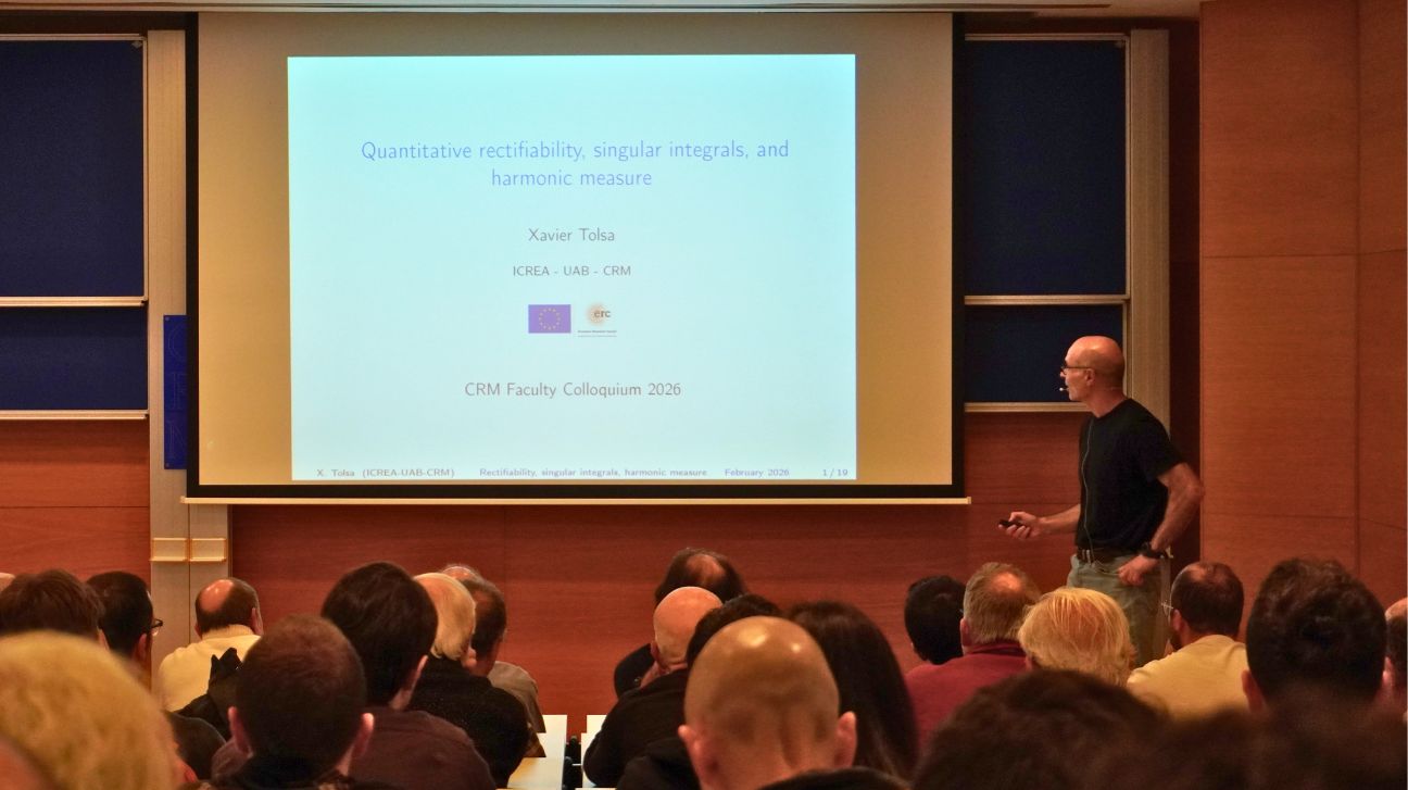 On 19 February 2026, the Centre de Recerca Matemàtica inaugurated its first CRM Faculty Colloquium, a new quarterly event designed to bring together the mathematical community around the research carried out by scientists affiliated with the Centre. The CRM auditorium filled up for this first edition, marked by the prestige and international recognition of its three speakers: Xavier Tolsa, Joaquim Ortega-Cerdà, and Xavier Cabré, all invited participants at the International Congress of Mathematicians (ICM 2026) in Philadelphia. Their joint presence in the same ICM — an unprecedented occurrence — served as a unifying thread of the colloquium, a shared source of pride, and an element that added special symbolic significance to the event.