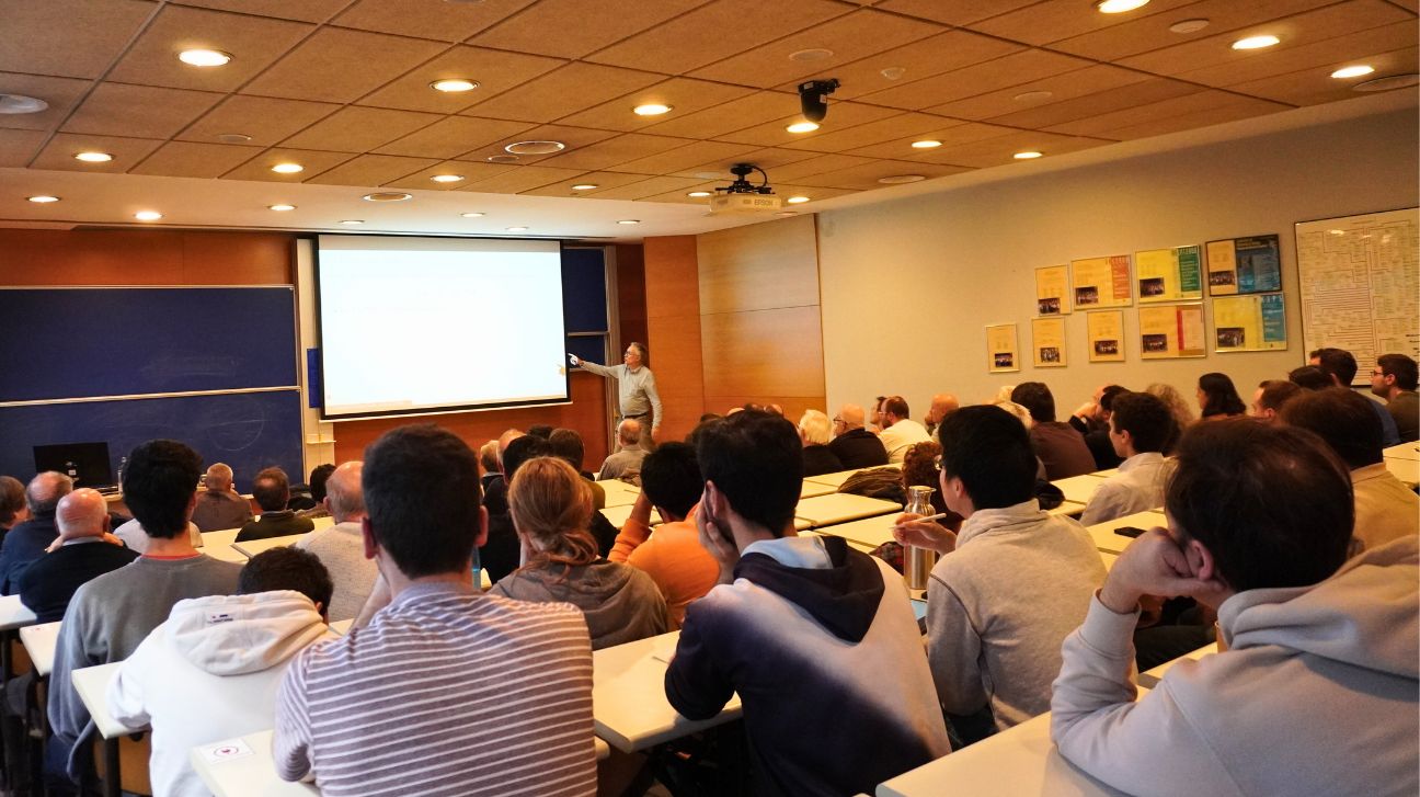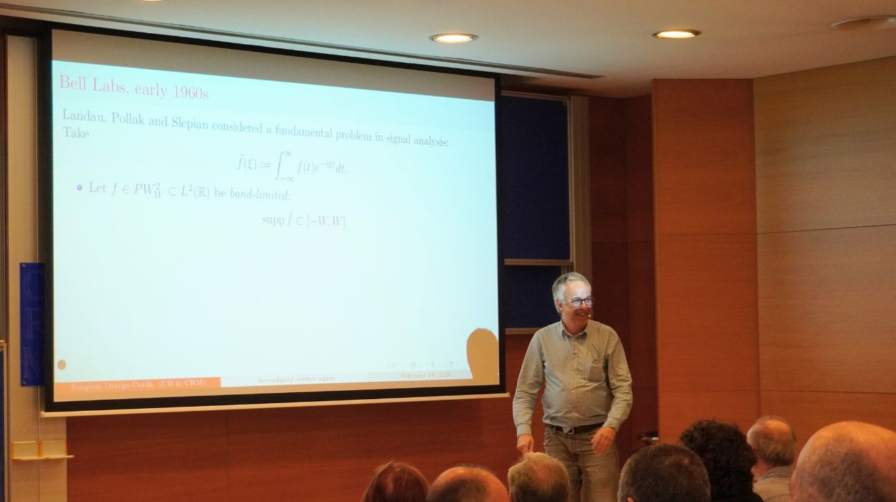 The second lecture, Serendipity strikes again, was delivered by Joaquim Ortega-Cerdà (UB – CRM), who has been invited to the Analysis section of the ICM. Ortega-Cerdà guided the audience through a fascinating journey connecting a classical problem from the Bell Labs in the 1960s with a recent result in Fourier analysis. The “fortunate accident” that enabled Landau, Slepian, and Pollack to advance signal theory reappears in a different context: the characterization of an extremal function that maximizes its value at 0 among bandlimited functions with