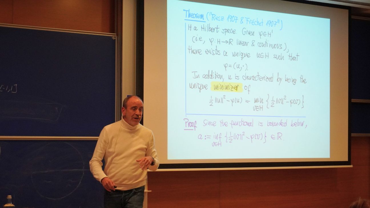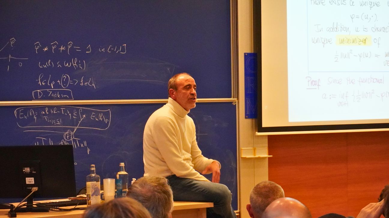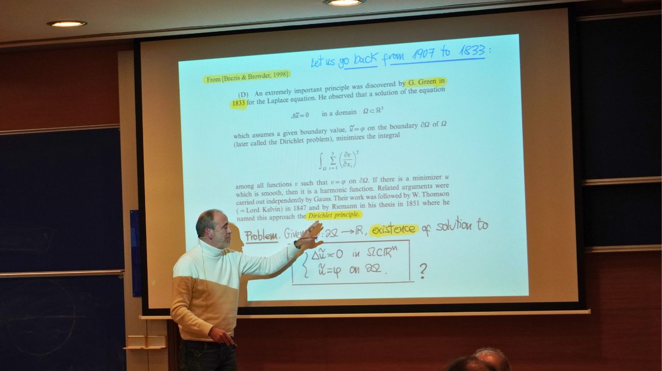 The session concluded with a lecture by Xavier Cabré (ICREA – UPC – CRM), invited to the Partial Differential Equations section of the ICM, titled Elliptic PDEs: recent extensions on Hilbert’s 19th problem. Cabré offered a historical and modern overview beginning with Hilbert’s 1900 question on the regularity of minimizers of variational integrals, followed by the foundational contributions of De Giorgi and Nash in the 1950s, and leading to Simons’ work on minimal surfaces in 1968. From there, Cabré focused on recent progress on the regularity of stable solutions, a much broader class than absolute minimizers. He presented results obtained in the past decade, including joint work with Figalli, Ros-Oton, and Serra, as well as contributions from other researchers on stable minimal surfaces. He also highlighted several important open problems, such as regularity in